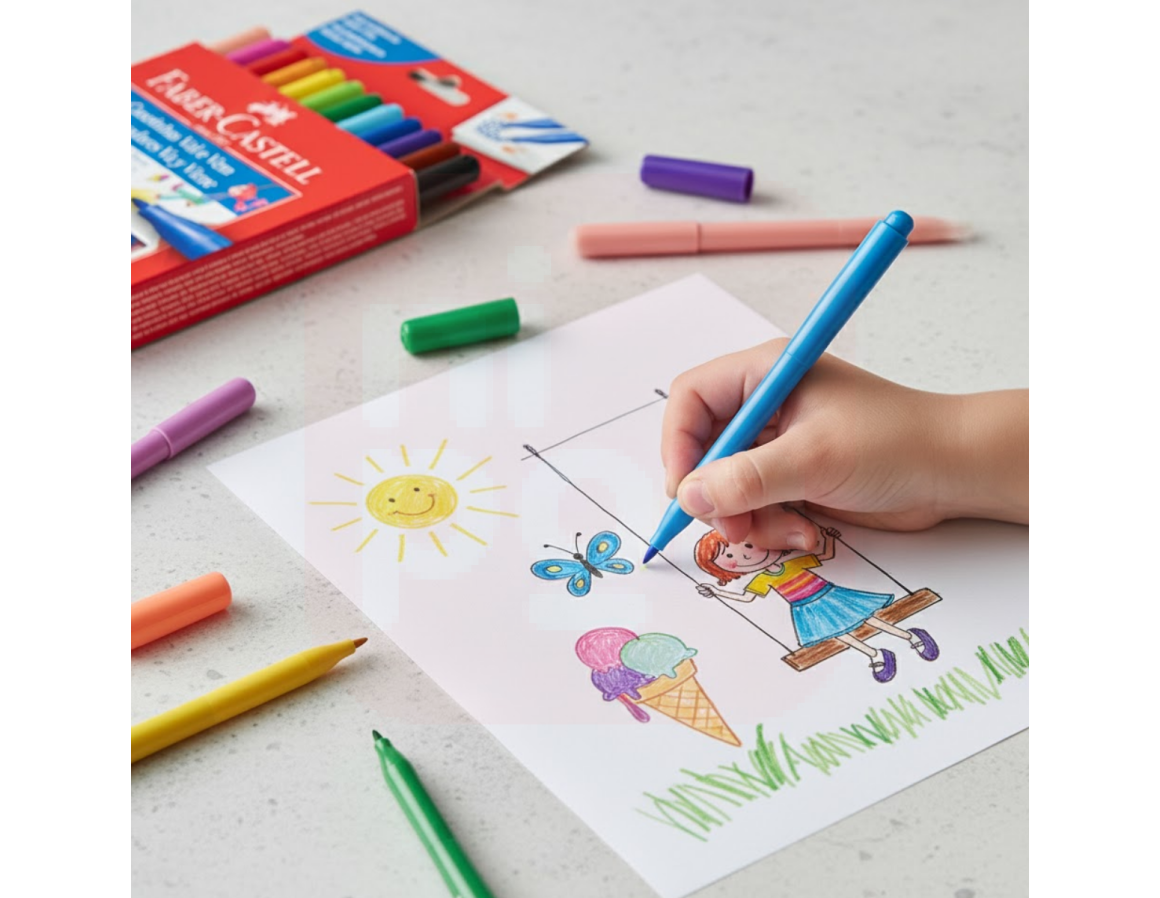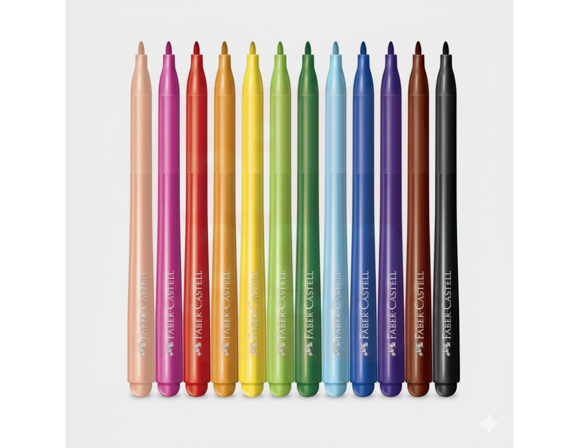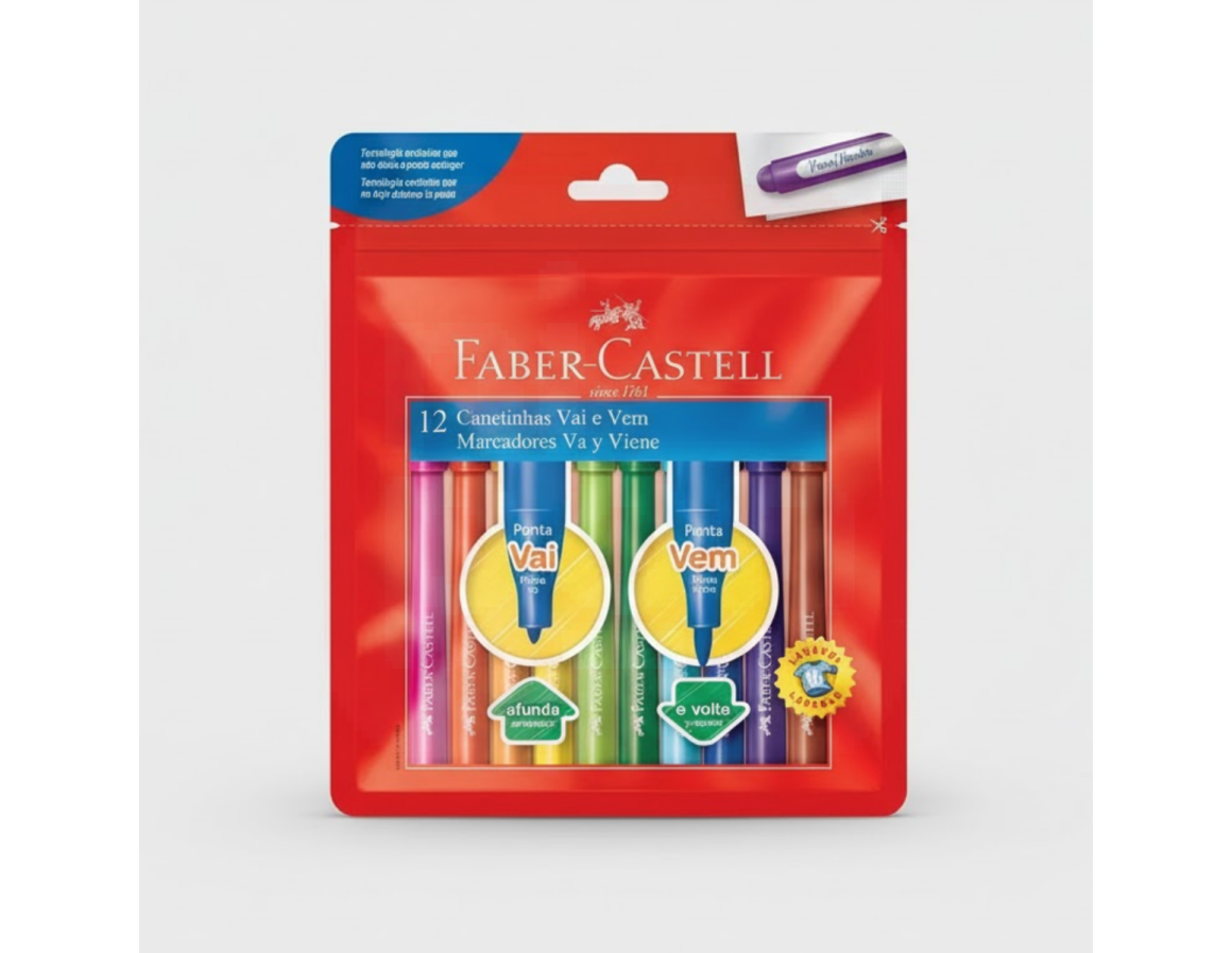 As Canetinhas 12 Cores Vai e Vem Faber-Castell foram desenvolvidas para transformar qualquer atividade de desenho em uma experiência divertida, prática e muito mais segura. Com o exclusivo sistema Vai e Vem, a ponta retrátil volta automaticamente ao seu interior após o uso, evitando danos, garantindo maior durabilidade e eliminando a necessidade de tampas — perfeito para crianças!