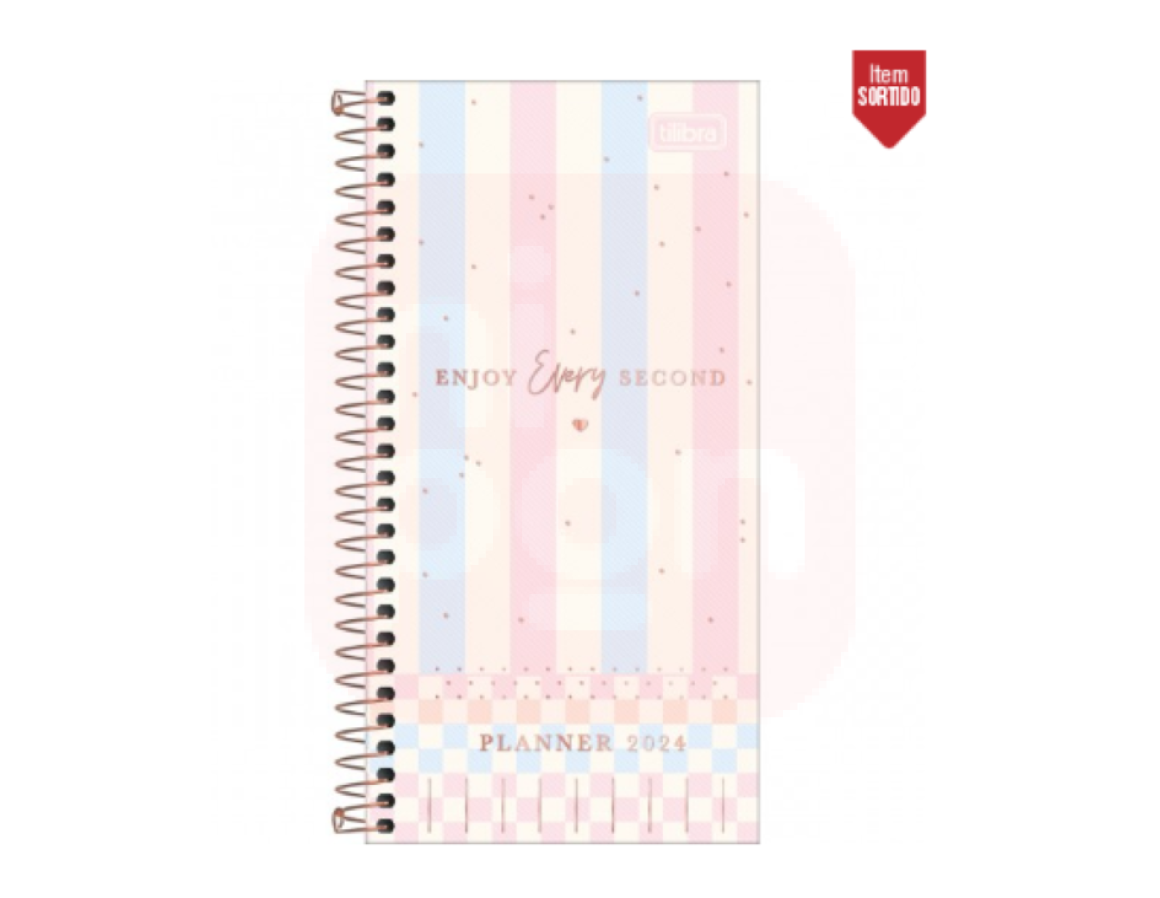 O Planner Espiral 11,9 x 24 cm Soho 90 G 2024 pode ser usado para organizar os compromissos do dia a dia, em casa, no trabalho e na escola. O produto, com visão anual, mensal e semanal, além de folhas para anotações, possui capa dura com detalhe metalizado, acabamento em espiral colorido, miolo com 80 folhas em gramatura 90 g/m², adesivos e bolsa de papel decorada para guardar papéis.