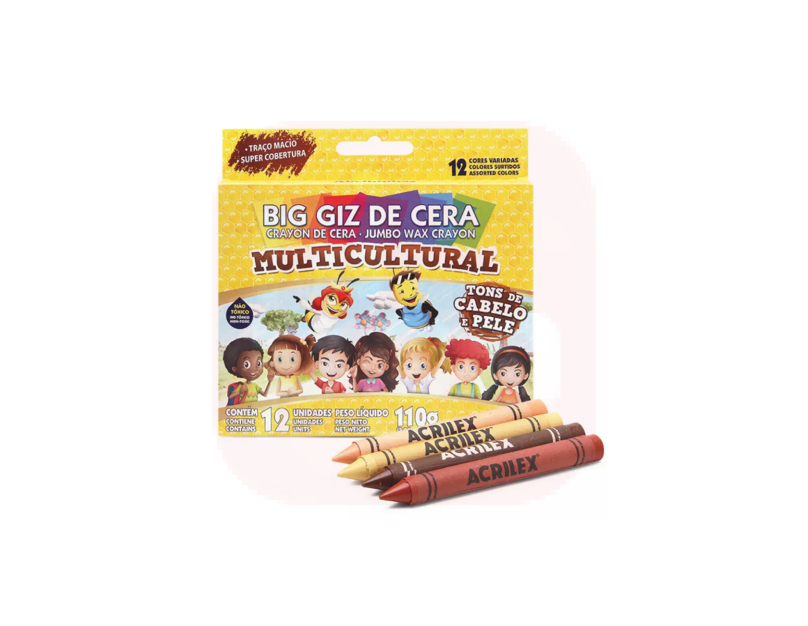 O Big Giz de Cera Multicultural com 12 cores da Acrilex foi desenvolvido para promover a inclusão e a representatividade desde os primeiros passos da educação. Com cores que representam diferentes tons de pele e diversidade cultural, esse conjunto estimula o respeito, a empatia e a valorização das diferenças através da arte.