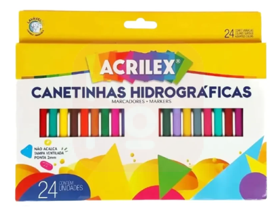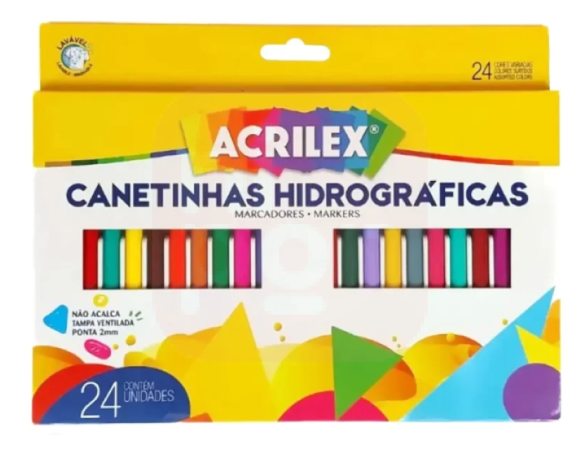 As Canetinhas Hidrográficas 24 Cores Acrilex são excelentes para desenhar, pintar e escrever sobre papel, papel cartão e cartolina.