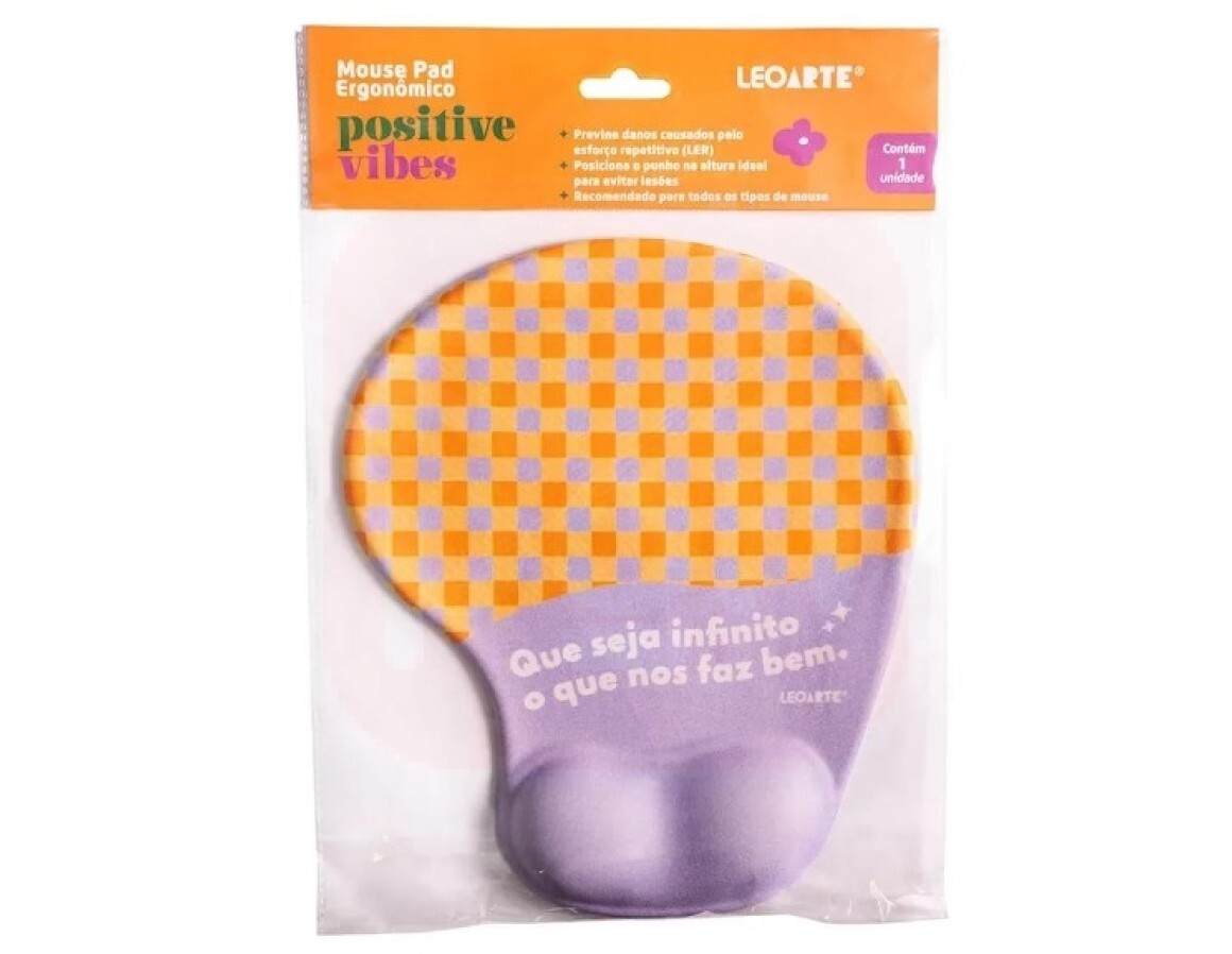 Agora você pode encher sua mesa de trabalho ou de estudos com muita energia positiva. Este modelo de mouse pad - da linha Posivite Vibes - é ergonômico, com cores e estampa contagiantes e uma frase de motivação para animar sempre a sua rotina. Possui formato anatômico com apoio de pulso, é revestido de tecido estampado e traz acabamento em solda. Que seja infinito o que nos faz bem, com a LeoArte.