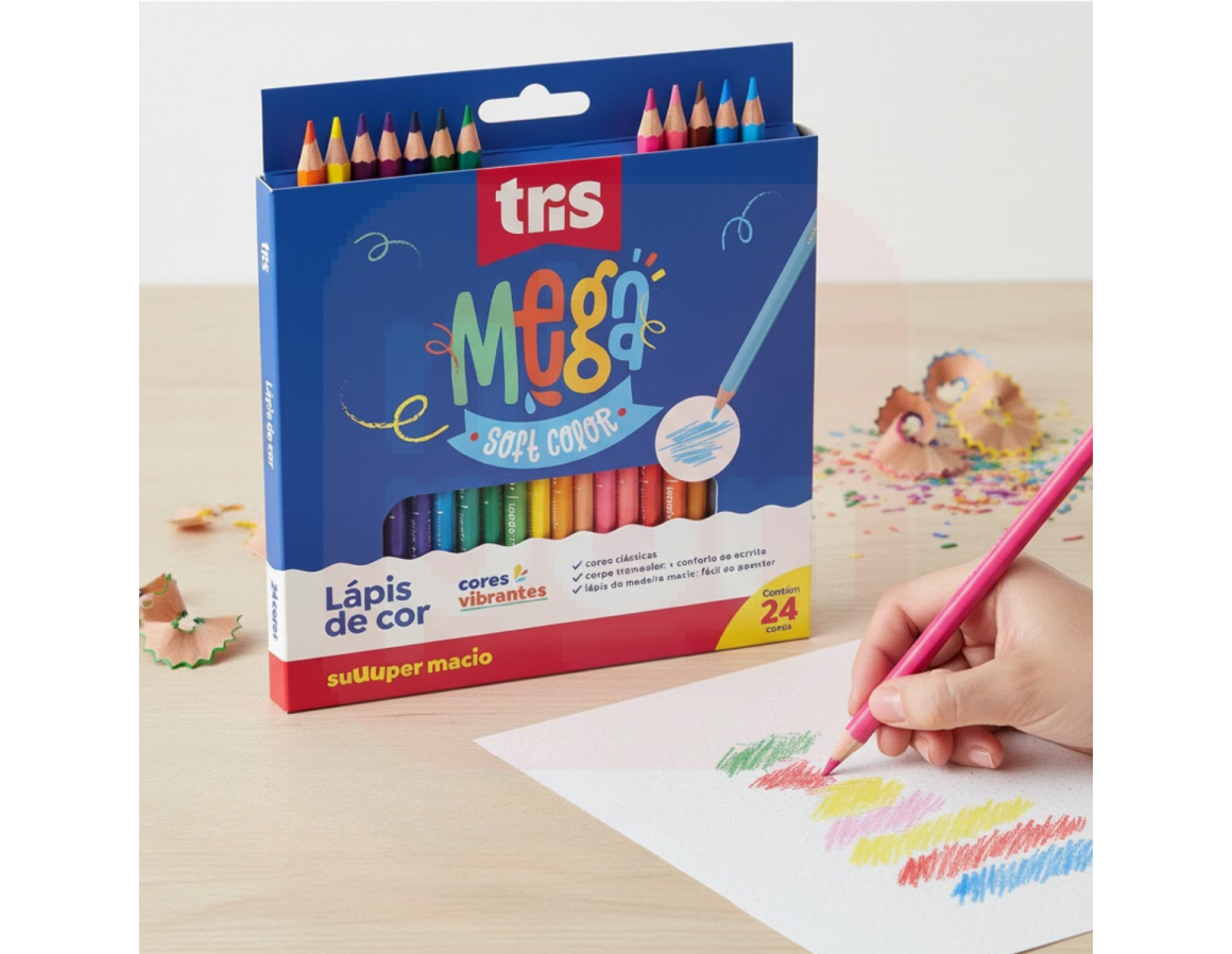 Deixe a criatividade fluir com o Kit Lápis de Cor Mega Soft Color 24 Cores + Apontador Tris.