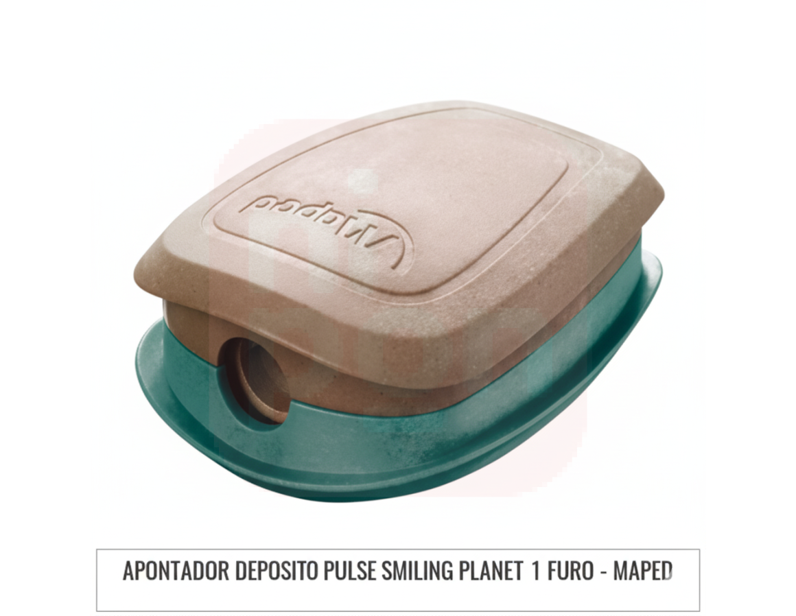 Este é um apontador com depósito, da linha Pulse Smiling Planet da Maped. Ele possui um design ergonômico e compacto, com cores que remetem à natureza, como o marrom claro na parte superior e um tom de verde-azulado na base. A parte superior é texturizada e o nome da marca "Maped" está em relevo. O apontador tem um único furo, adequado para lápis de tamanho padrão. A base em formato de cunha permite que ele repouse de forma estável sobre a mesa. A presença de um depósito integrado é prática para coletar as aparas, mantendo o ambiente limpo durante o uso.