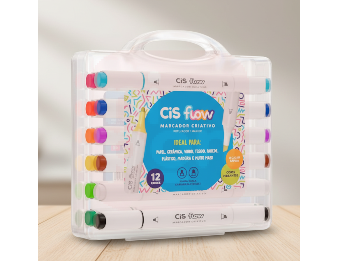 Marcador Criativo CIS Flow 12 Cores – Estojo Maleta - Ponta Dupla