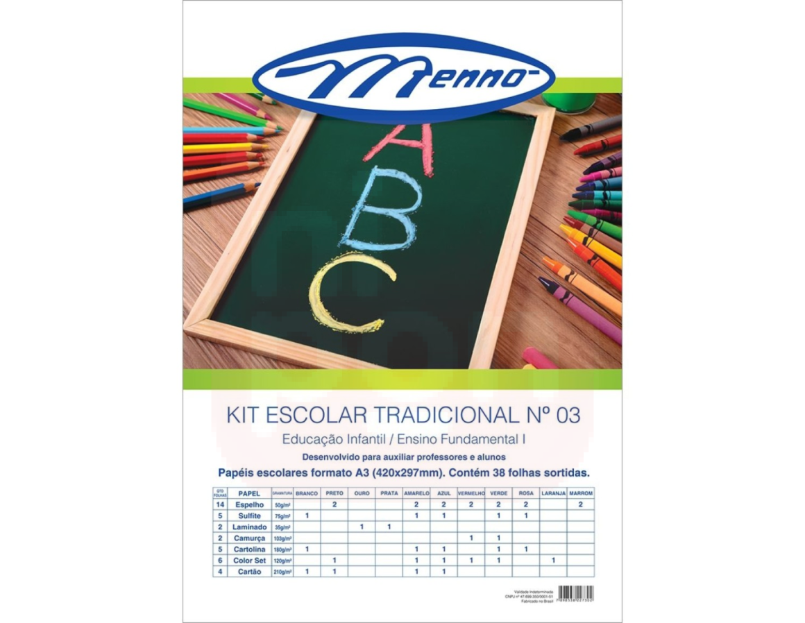 O Kit Escolar Tradicional Nº3 A3 da Menno é a escolha perfeita para estudantes e artistas que desejam variedade, qualidade e praticidade em um único conjunto.