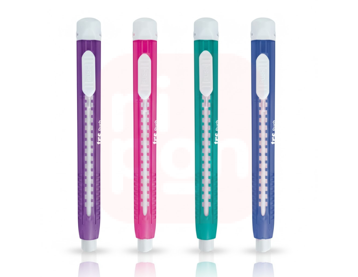 A Borracha Caneta Push Cores Tris oferece praticidade e estilo em um único produto. Com formato de caneta e mecanismo push (clique), permite o uso da borracha de forma precisa e limpa, ideal para anotações, estudos e desenhos.