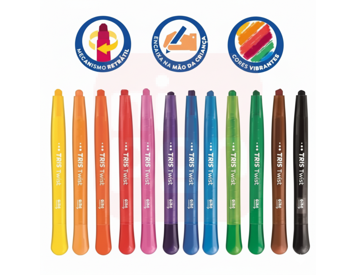 O Giz de Cera 12 Cores Retrátil New Twist da Tris é perfeito para soltar a criatividade com praticidade e sem sujeira. Com sistema retrátil, dispensa o uso de apontador, evitando desperdícios e mantendo as mãos sempre limpas. Suas cores são vivas, intensas e de alta cobertura, ideais para desenhos, pinturas e atividades escolares. O formato anatômico proporciona conforto no uso prolongado, sendo ideal para crianças e adultos. Mais praticidade, cor e diversão em um só produto!